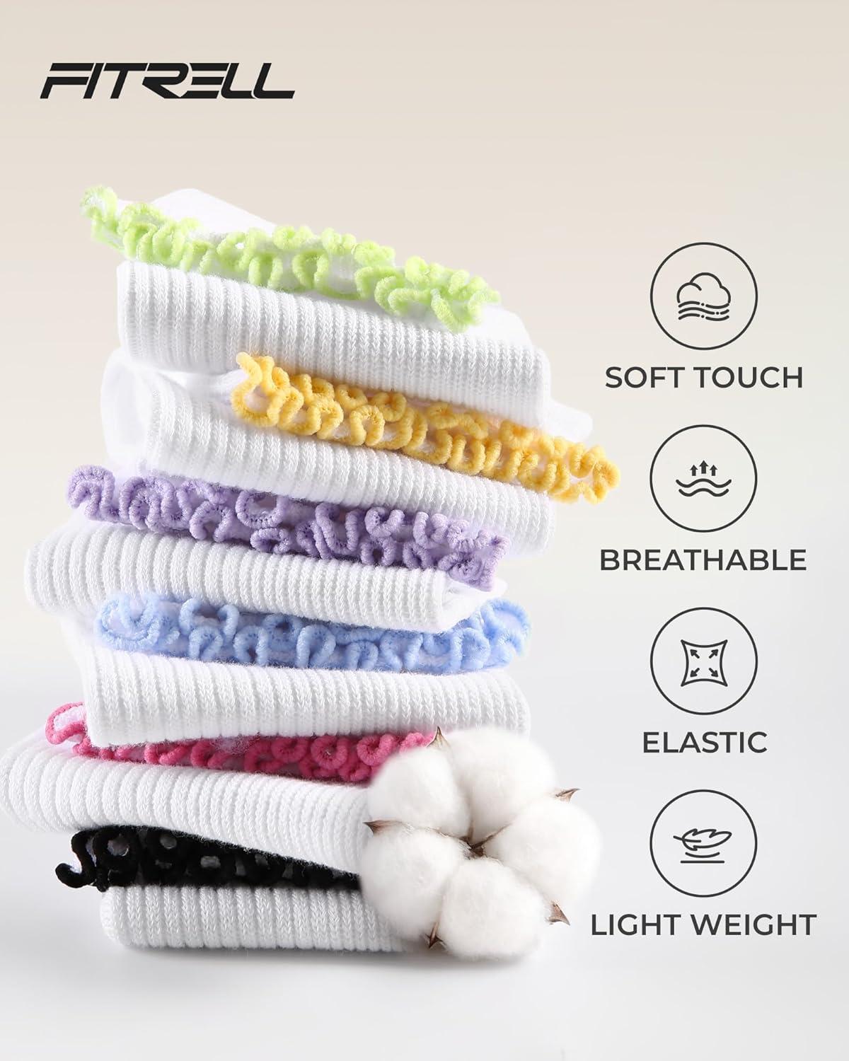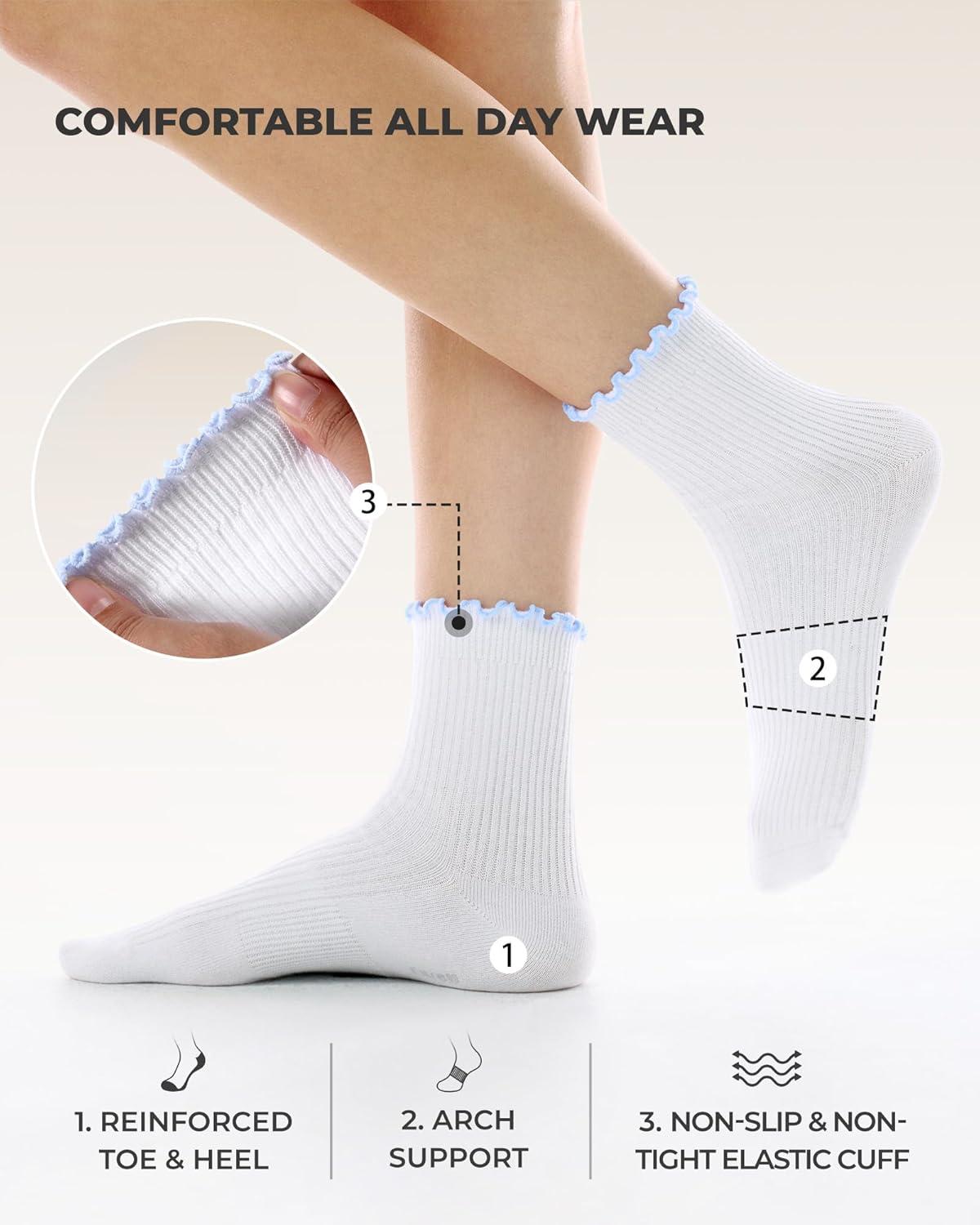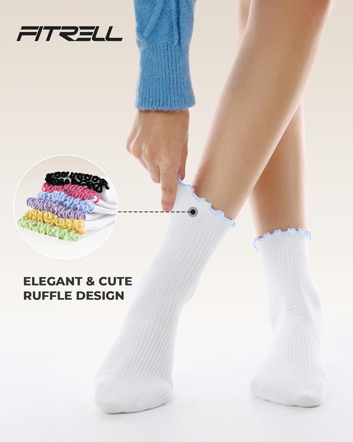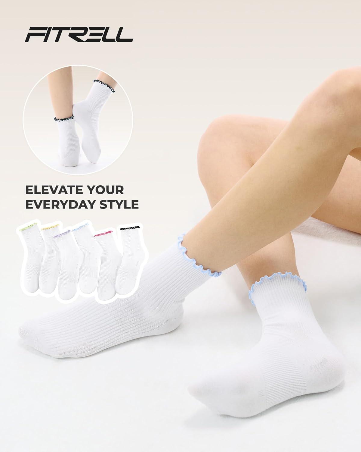 FITRELL 6 Pairs Ruffle Socks, Womens Soft Breathable Cute Lettuce Ankle Crew Frilly Socks(White With Multicolor Edge)