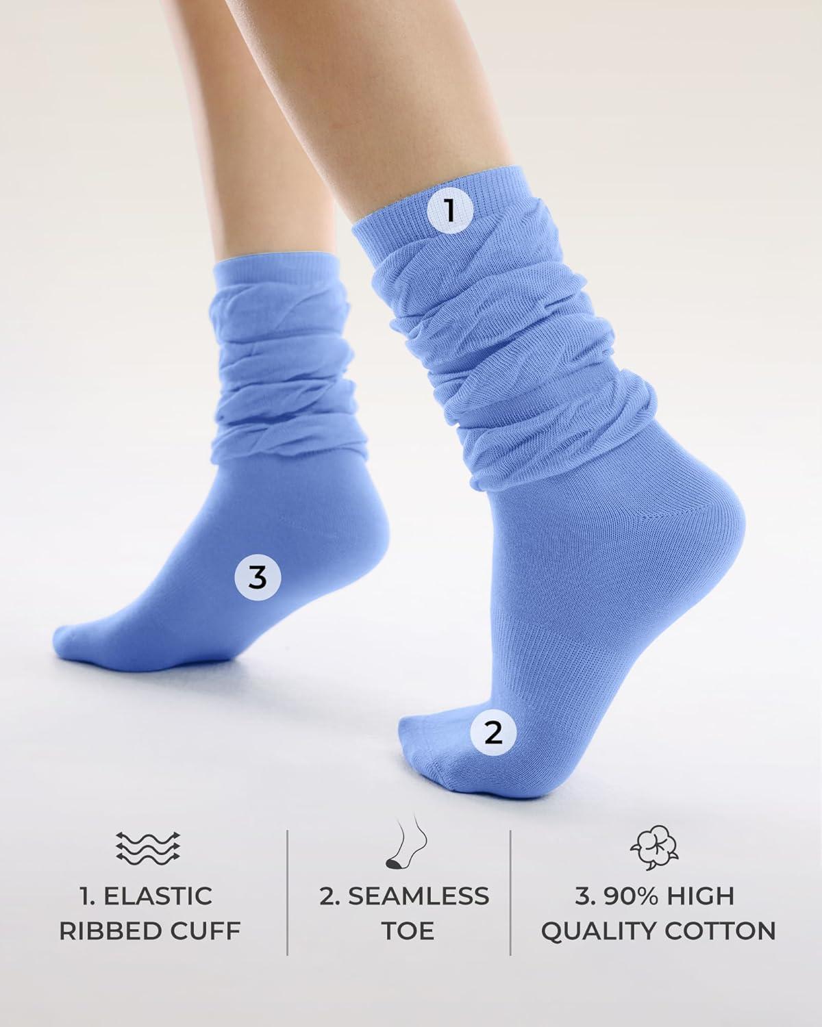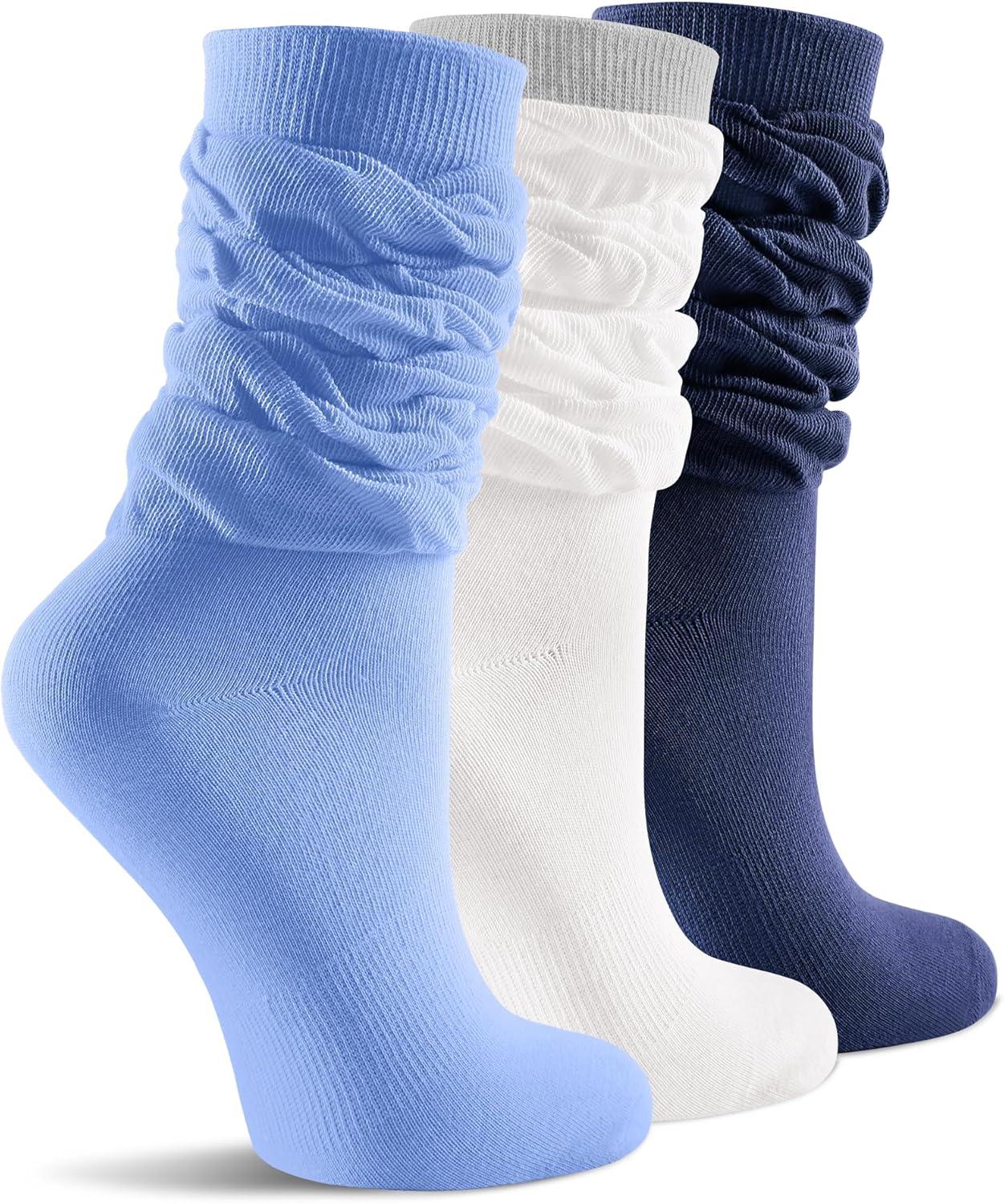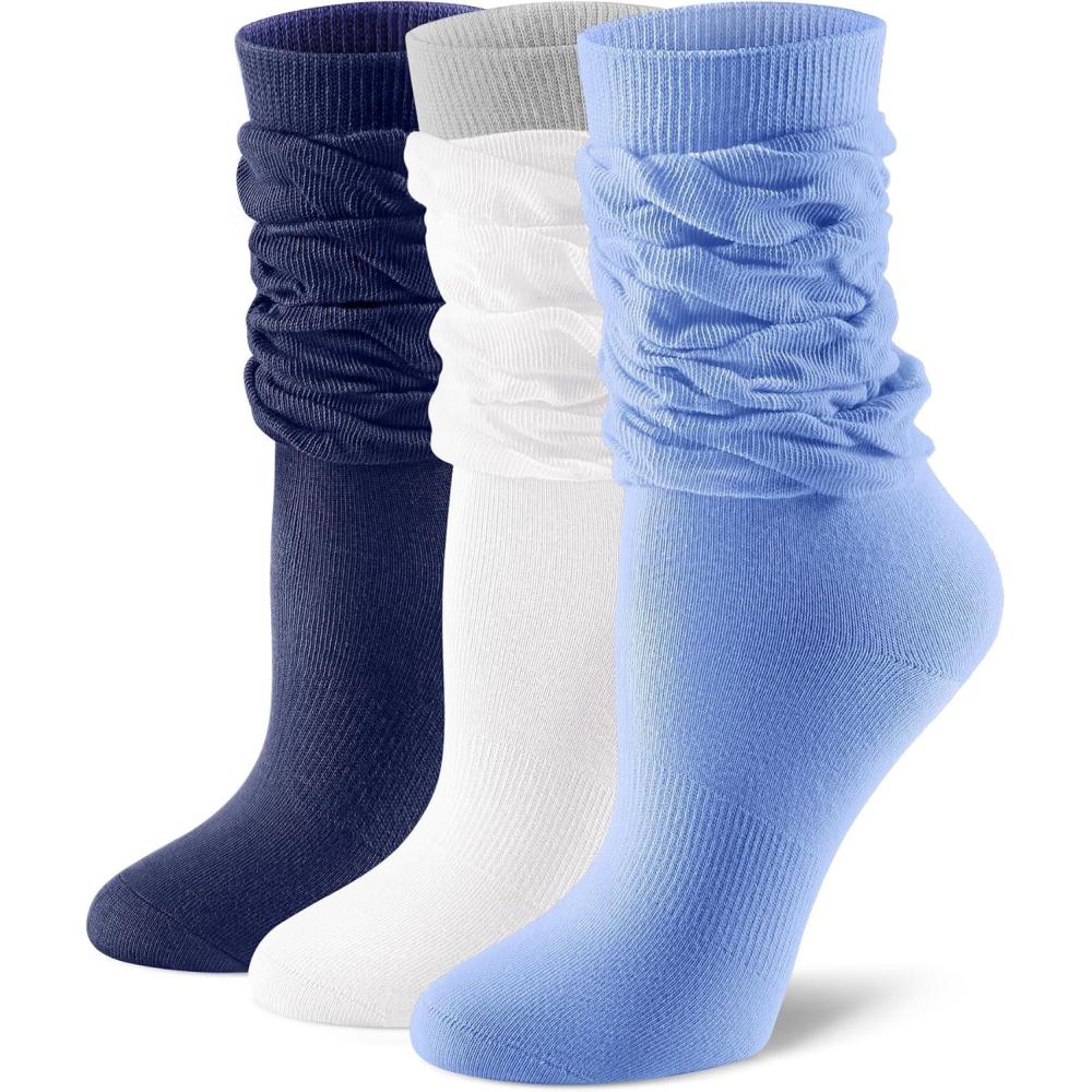 FITRELL Slouch Crew Socks for Women, 3 Pairs Soft Cotton Mid Calf Cute Retro Scrunch Socks(White Grey+navy+royal Blue)