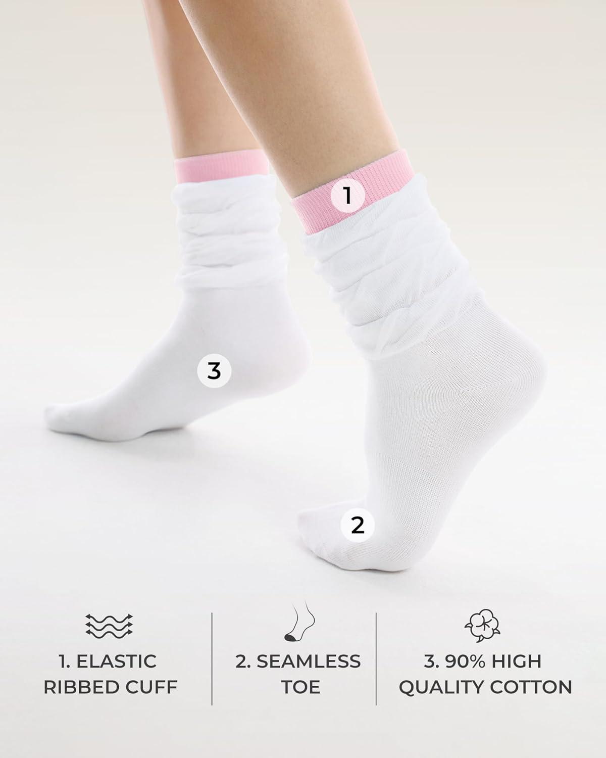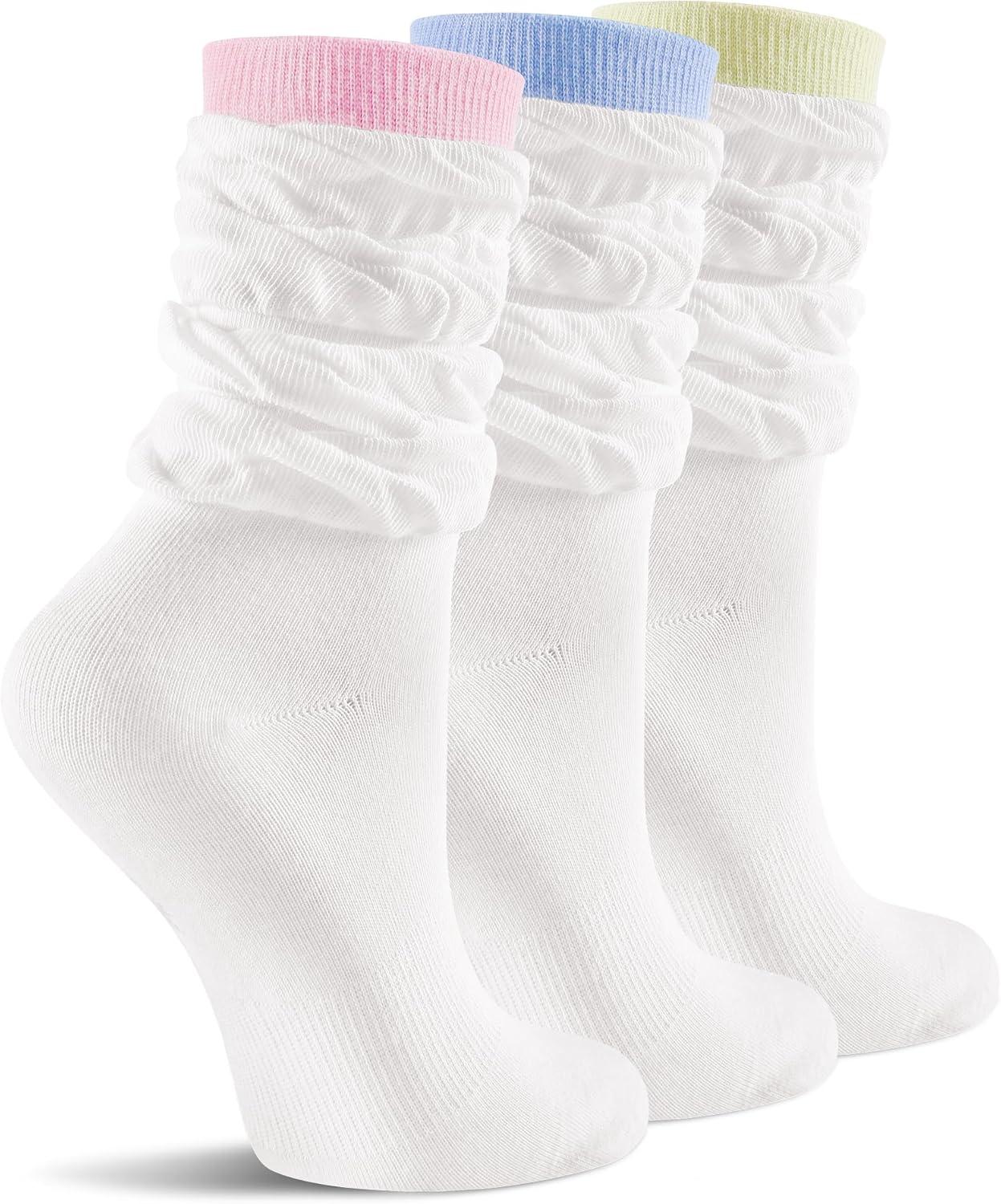 FITRELL Slouch Crew Socks for Women, 3 Pairs Soft Cotton Mid Calf Cute Retro Scrunch Socks(White Pink+white Blue+white Green)